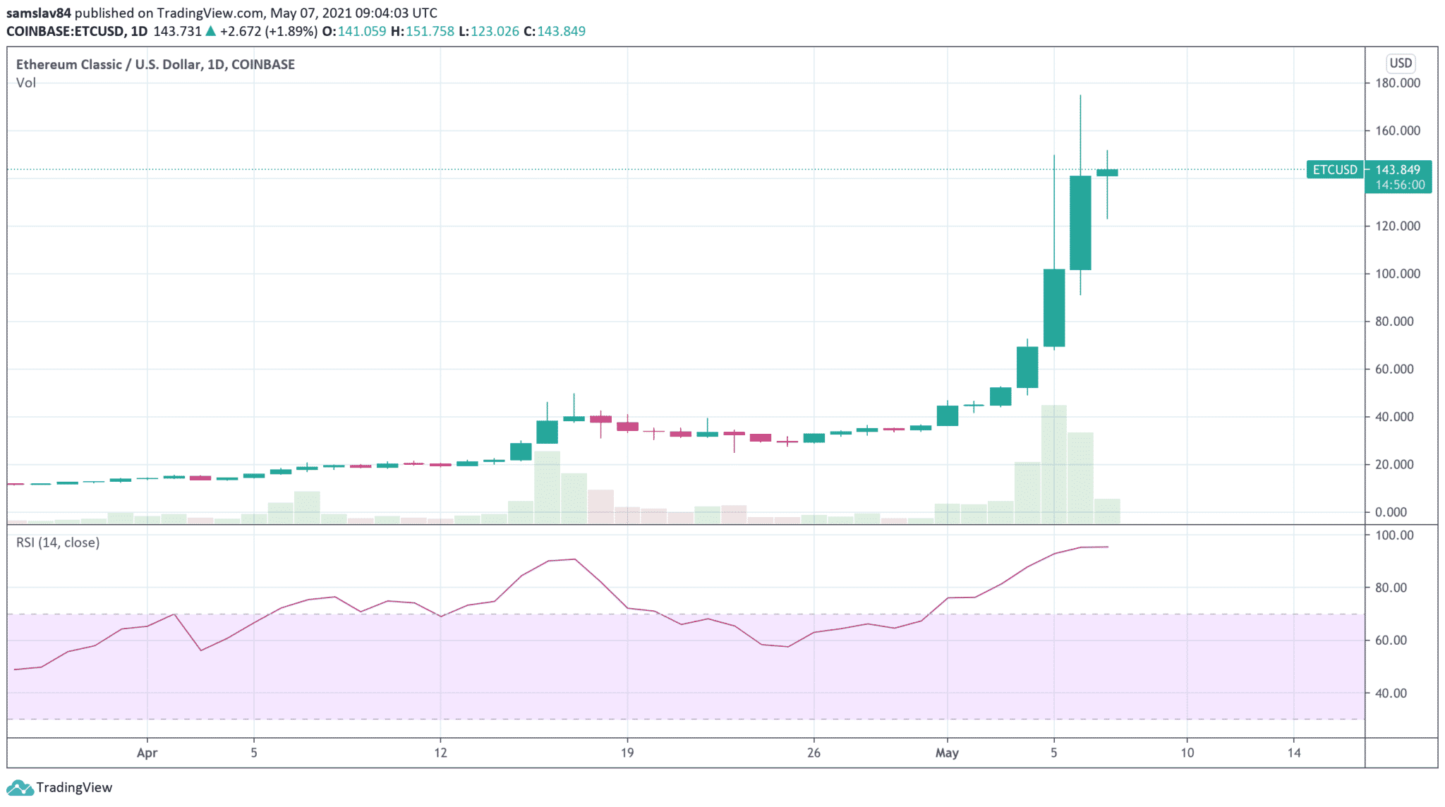 Kryptomenová mánia tento týždeň dosiahla nový vrchol. Shitcoin párty pokračuje. Dogecoin DOGE, vytvorený v roku 2014, ako vtip, dosahuje kapitalizáciu 80,5 miliárd dolárov, Bitcoin Cash za posledných 7 dní stúpol o 50% a potom tu máme Ethereum Classic. Zisk 300% za jeden týždeň a presun do TOP15 najväčších kryptomien.