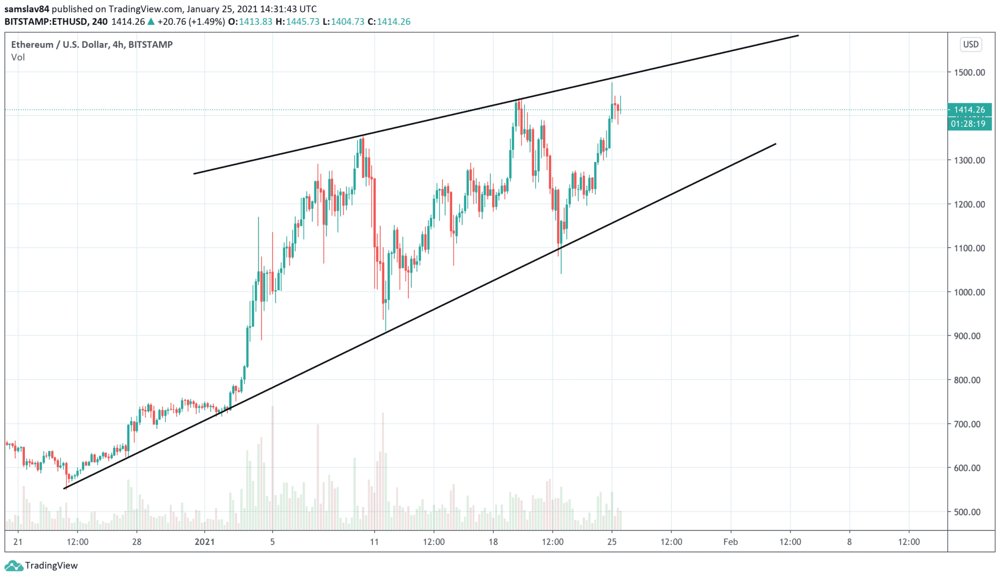 Ethereum dnes testuje historické maximum. Hodnota tejto kryptomeny začala rásť už cez víkend. Pred troma hodinami cena na burze Bitstamp na chvíľku skočila na 1471 $. Ešte však neoslavujme, pretože ether má nad sebou okrúhlu hladinu 1500 $. Ak sa mu podarí uzavrieť daily, alebo dokonca weekly sviecu, nad touto cenou, môže to spustiť kaskádovú reakciu a ďalšie nákupy. Nedivili by sme sa, ak by ETH v krátkom čase otestovalo aj $2000.