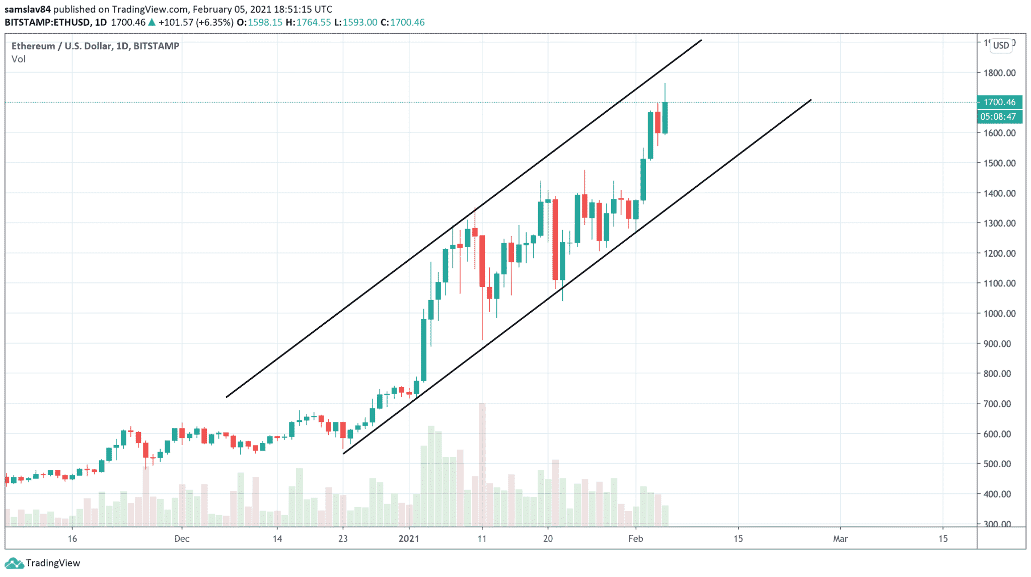 Ešte na začiatku roka sme avizovali, že Ethereum s veľkou pravdpeodobnosťou v najbližších týždňoch dosiahne hladinu 2000 $. V okolí tejto okrúhlej hladiny sa nachádza prvá veľká Fibonacci Extencion rezistencia, na ktorej bude trh nejakú dobu konsolidovať. Ether sa dnes opäť priblížil k nami predikovanej hladine, keď pred hodinou atakoval 1750 $.