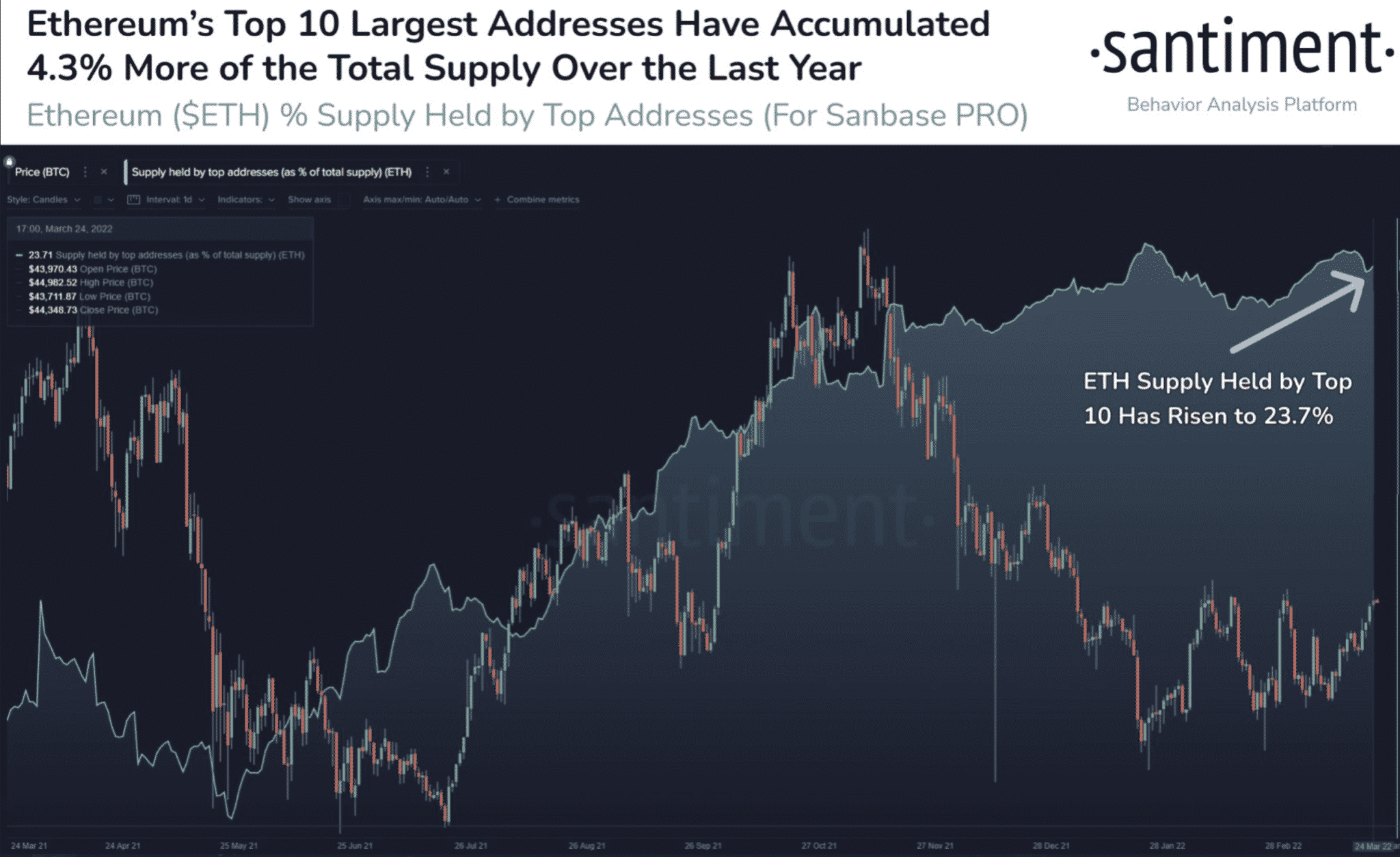 Podľa najnovších údajov spoločnosti Santiment investori ETH vo veľkom akumulujú, a to aj napriek volatilite. V čase písania tohto článku držalo 10 najväčších veľrýb takmer 5 % z celkovej ponuky v porovnaní s minulým rokom.