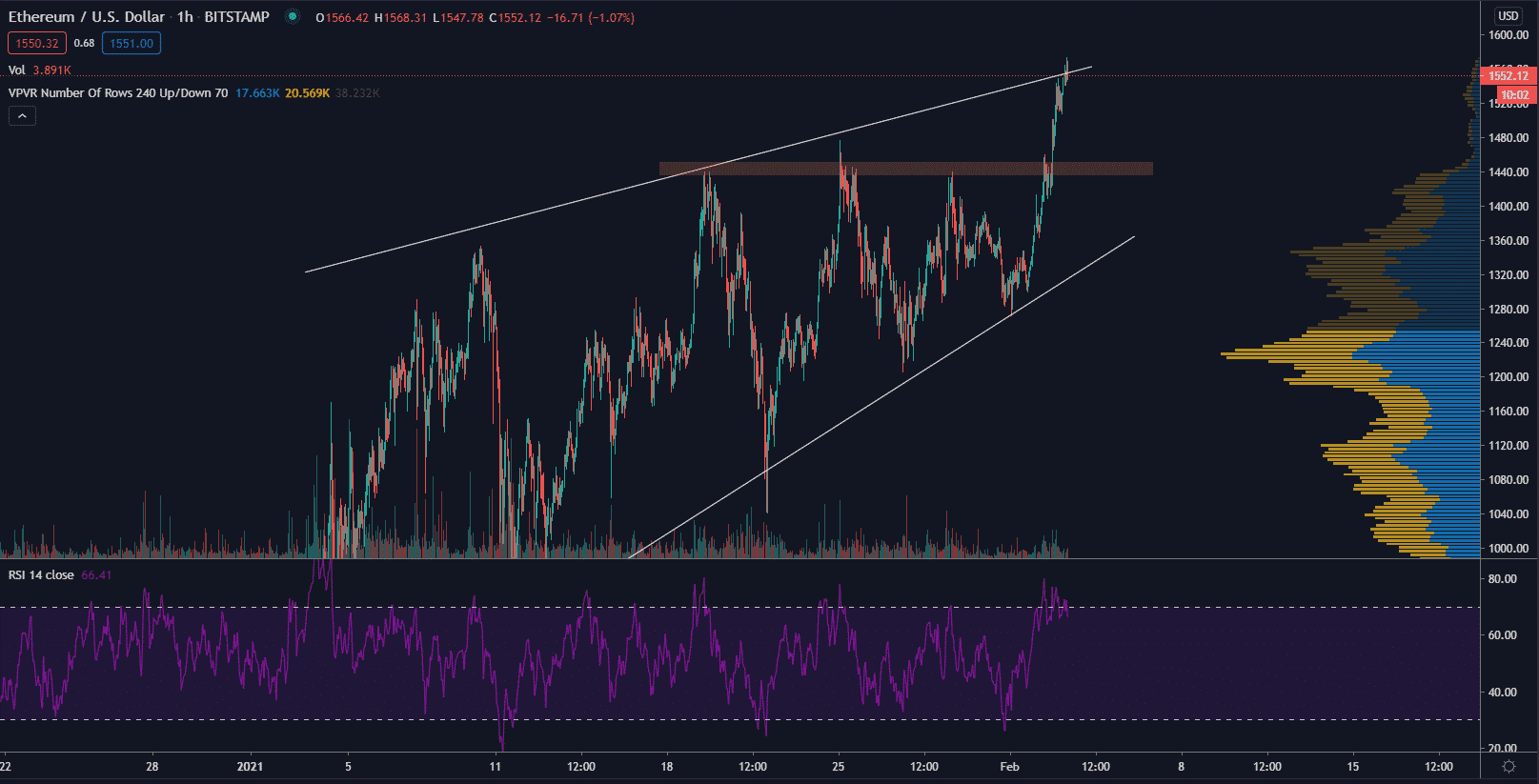 Momentálne sa počas písania tohto článku ETH obchoduje za hodnotu 1,550$. Hovoríme tu o dennej zmene 2,45%, pričom sme narazili na potenciálnu rezistenciu. Bude ju cena rešpektovať alebo nie? To ukáže iba čas, no rok 2021 bude zjavne pre Ethereum kľúčový a prekonávanie ATH ani zďaleka nie je za nami.
