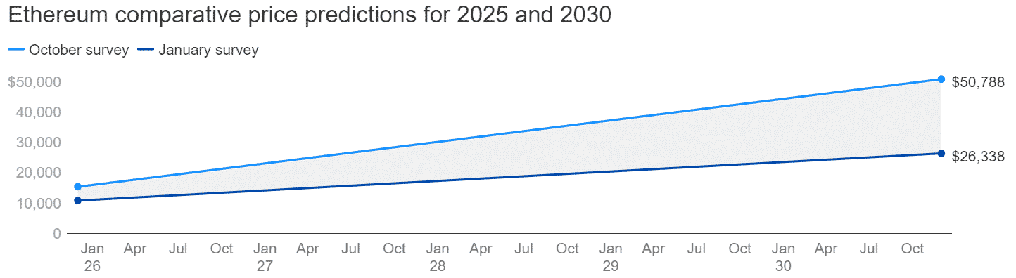Aj napriek nedávnemu poklesu sa 33 austrálskych kryptografických expertov zo spoločnosti Finder vyjadrilo, že Ethereum môže tento rok dosiahnuť až 7 609 USD. Zaujímavosťou je, že najnovšie predpovede spoločnosti na rok 2025 a 2030 boli o 30 až 48 % nižšie ako predikcie z októbra minulého roka.