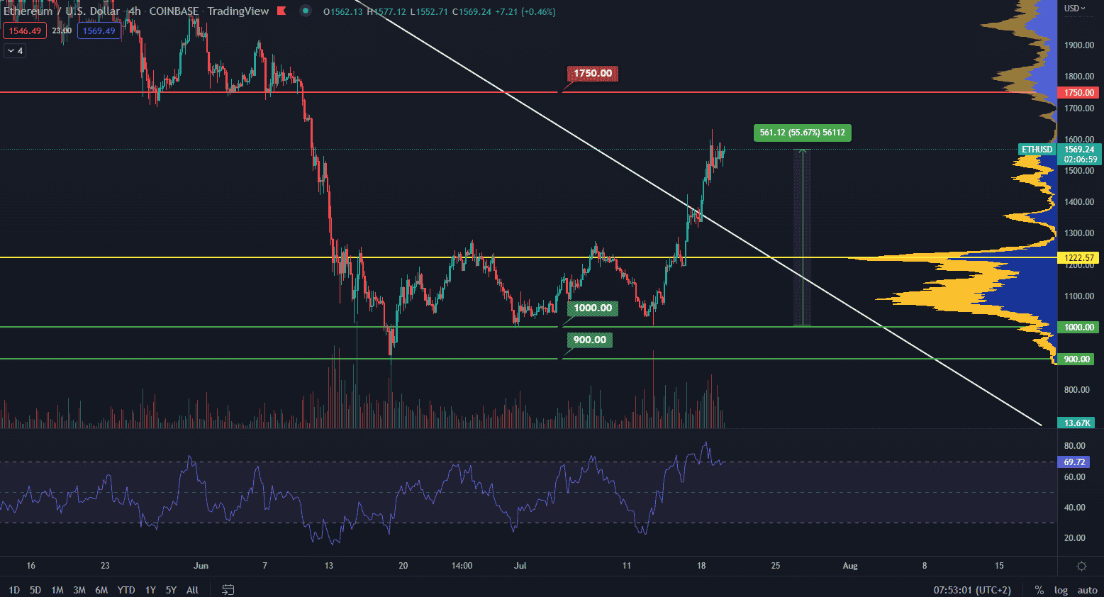 Cena prekonala rastom rezistenciu, ktorá bola aktuálna od apríla. Pre porovnanie, za rovnaké časové obdobie Bitcoin narástol „iba” o 25 %. Najbližší target, ktorý budeme na Ethereu sledovať, je pásmo okolo 1 750 dolárov. Toto pásmo vychádza z predošlej sideway štruktúry, ktorá vznikla v máji.