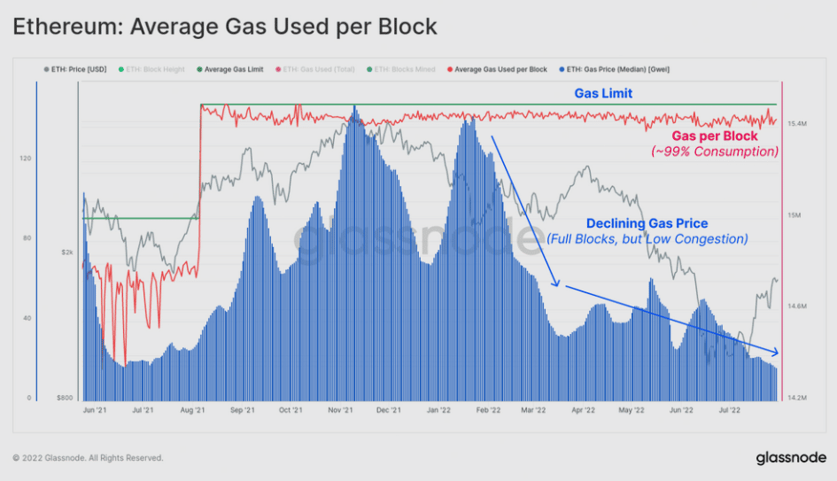 Zaujímavosťou je fakt, že preťaženie siete je aktuálne na nízkych úrovniach vzhľadom na nedávny prudký nárast spotovej ceny ETH. Preťaženie priamo súvisí s poplatkami a aktuálne sa to prejavuje ako niekoľkoročné minimum v cenách za plyn.