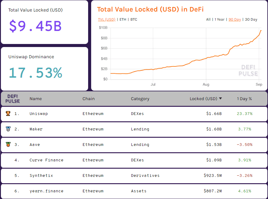 Boom na DeFi trhu zamiešal aj prvú päťku najväčších projektov. Projektom s najväčšou kapitalizáciou je v súčasnosti decentralizovaná burza (DEX) Uniswap. S kapitalizáciou 1,66 miliardy dolárov tesne prekonáva dlhodobého lídra Maker. Na treťom mieste sa drží Aave. Bilión dolárov prekonáva aj druhý najväčší DEX súčasnosti Curve Finance.