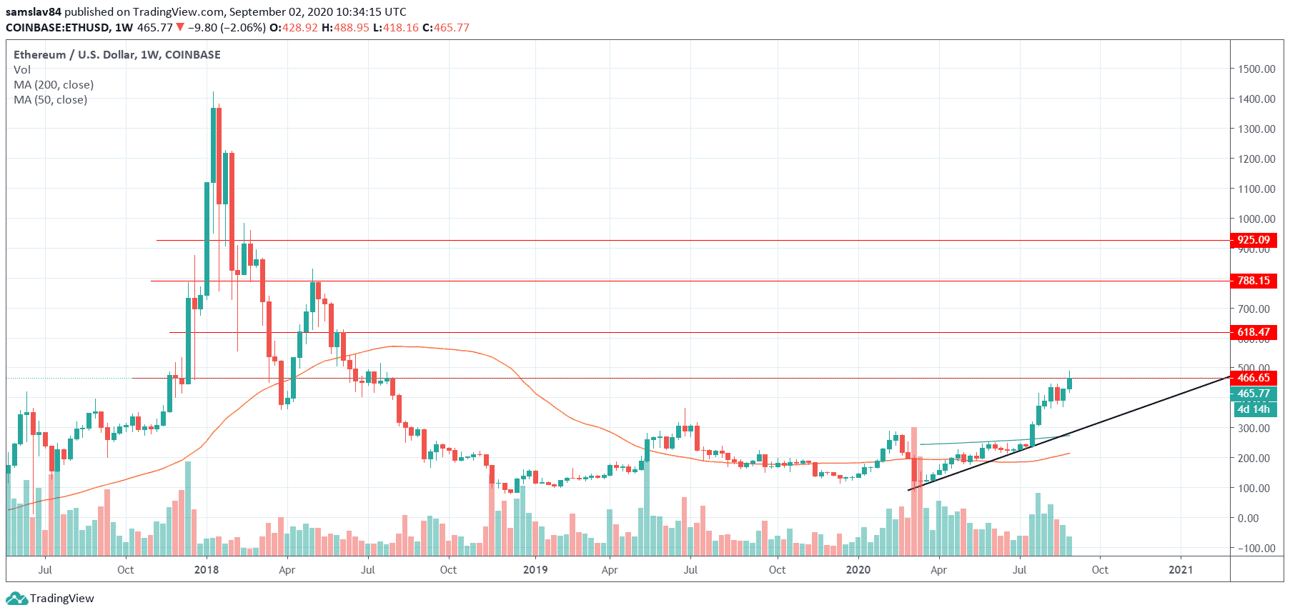 Cena Etherea dnes prekonala tohtoročné maximum a spolu s ním aj silnú rezistenciu. ETH sa totiž v minulosti mnohokrát odrazilo od hladiny 400-450 $ a veľa krát ju táto technická úroveň podržala pred ďalším pádom. Po jej prekonaní sa Ethereu otvára cesta smerom hore.