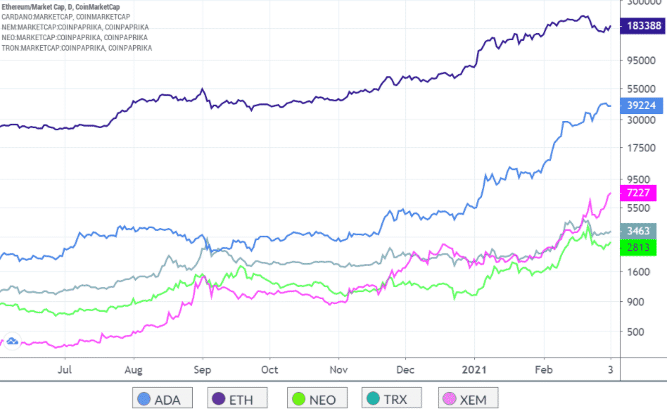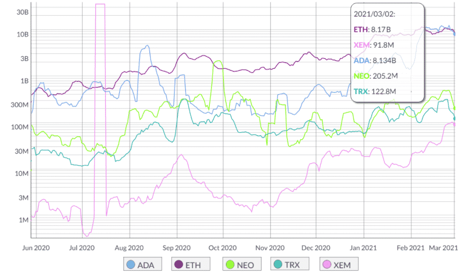 Tieto údaje by sa mali aspoň teoreticky prejaviť v trhovej kapitalizácii. Preto má zmysel, aby ETH dominovalo v rebríčku, pretože žiadna iná sieť sa ani len nepribližuje týmto decentralizovaným aplikáciám. Navyše pri analýze hodnoty transakcií vedie Ethereum 50-krát.