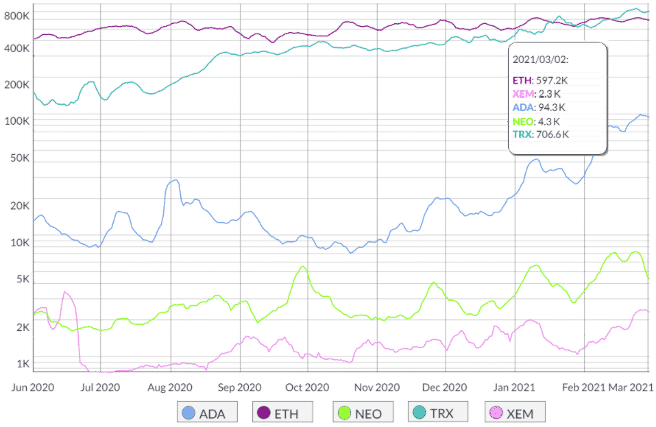 Ako je uvedené vyššie, sieť Ethereum v prevažnej miere dominuje v decentralizovaných aplikáciách (dApps). Z dôvodu vysokých poplatkov za transakcie sa zdá, že newtork spoločnosti Ethereum je pri analýze počtu aktívnych adries pre svojich konkurentov nevýhodný.