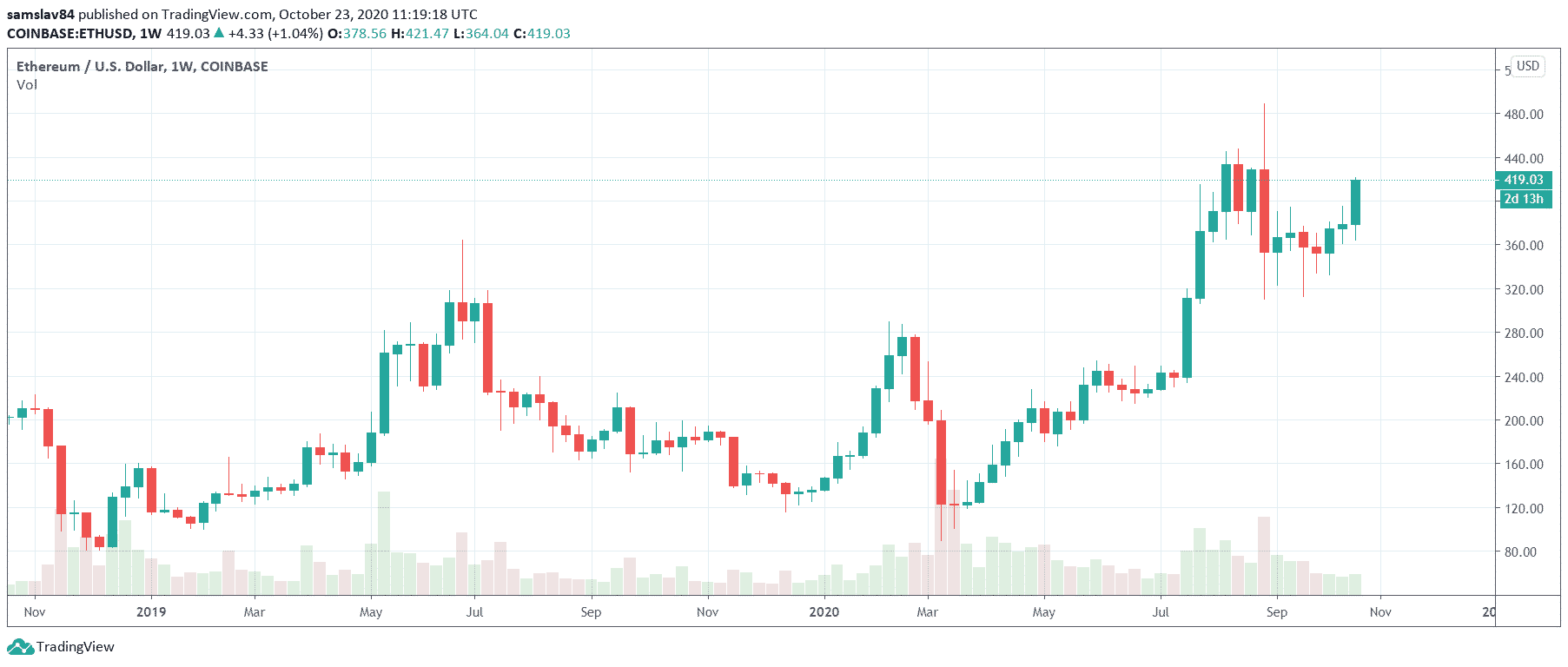 Za tento nárast môže okrem DeFi aj vysoká hodnota mincí. Ethereum sa v súčasnosti obchoduje za 418 $ a v posledných dňoch prekonalo silné rezistenčné pásmo 380-405 dolárov. Kľúčové je však uzavrieť nad touto hladinou aspoň dve weekly sviece.