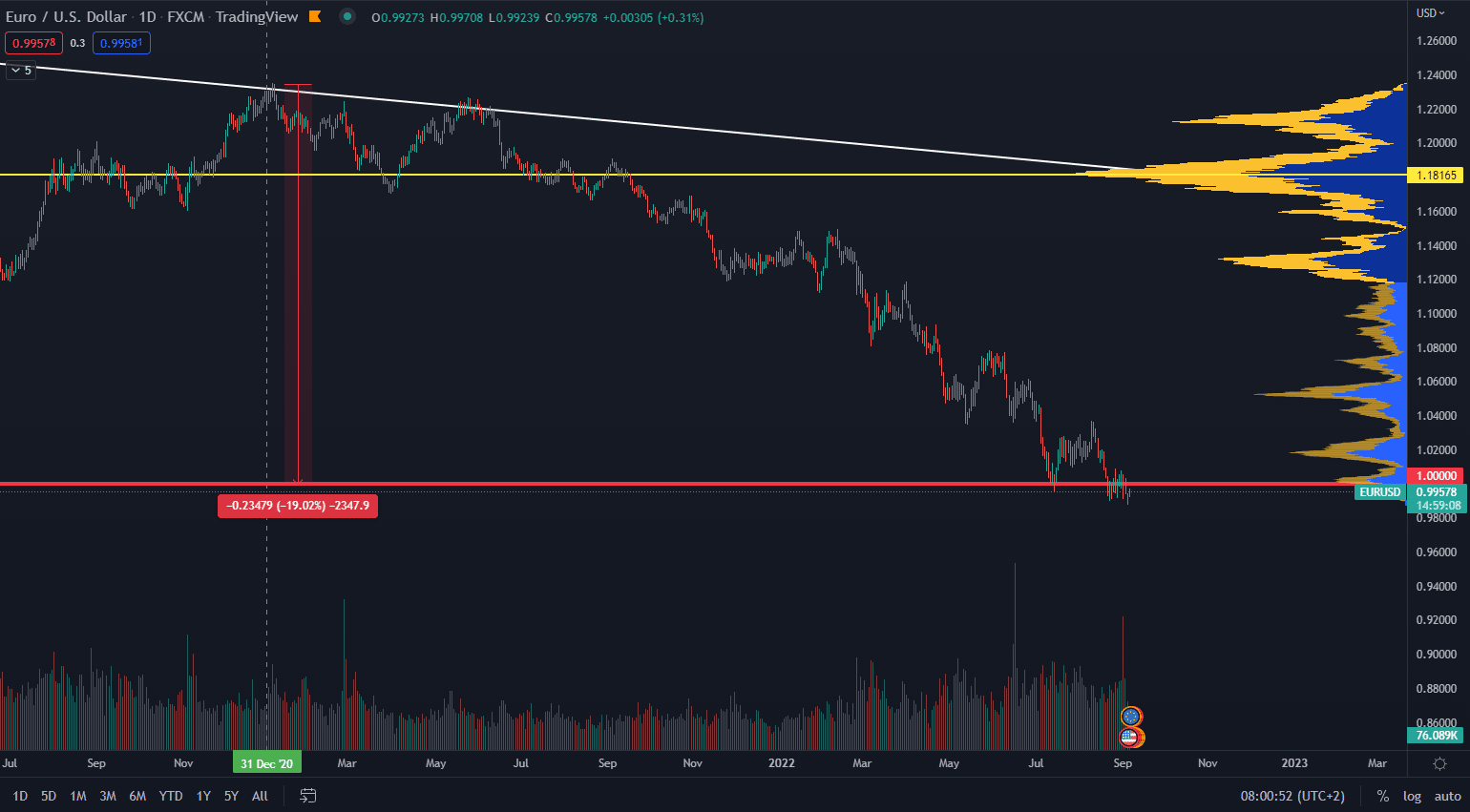 Zvyšovanie úrokových sadzieb však spomalí ekonomiku, čo v konečnom dôsledku môže podporiť recesiu na kontinente. Aktuálna situácia preto naznačuje, že euro voči doláru stále môže spadnúť nadol a vytvoriť nové minimum, čo by predstavovalo väčší rekord znehodnotenia za posledných 20 rokov. Dolárový index DXY medzitým rastie na súčasných 109 bodov a dosahuje nové maximá.