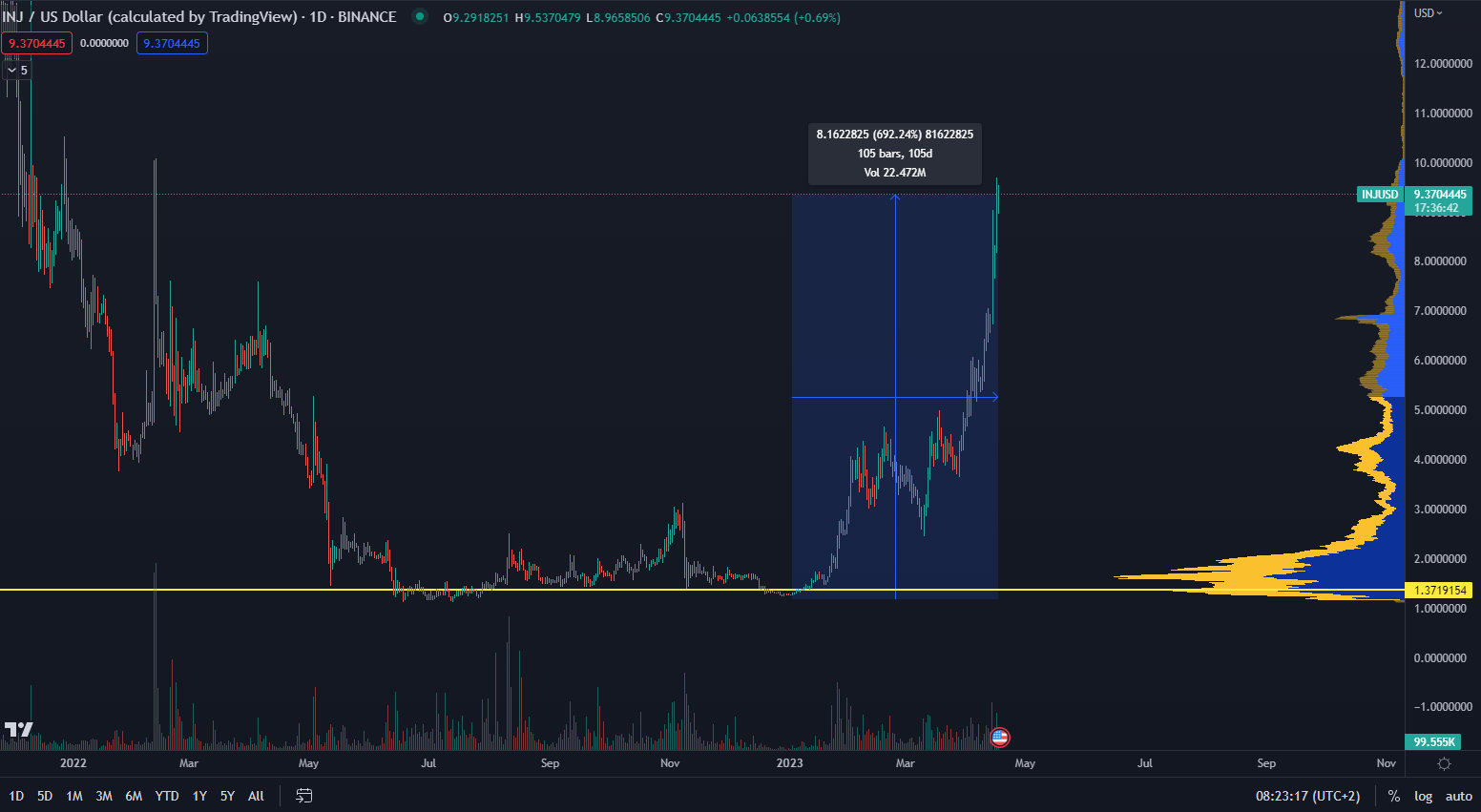 Trhová cena sa nachádza na úrovni 9,37 dolára v čase písania článku. Od začiatku roka to predstavuje nárast o neuveriteľných 700 %, zatiaľ čo len počas apríla dokázala kryptomena narásť o 150 %. Naposledy sa na rovnakej cenovej úrovni INJ obchodovalo ešte vo februári 2022.