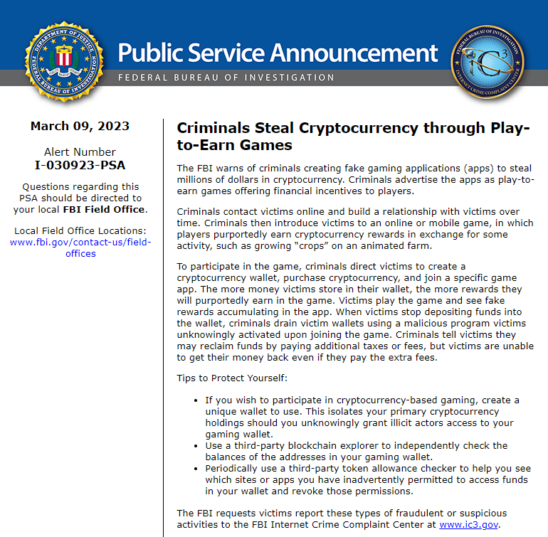 Kryptomeny sú predmetom čoraz väčšieho dohľadu a prispievajú k tomu aj udalosti z posledného roka. Najnovšie, podľa správy News Bitcoin, FBI varovala širokú verejnosť pred kryptomenami, ktoré sú využívane v schémach play to earn. Údajne ide o podvody, kde pomocou malvéru zločinci získavajú prostriedky z peňaženiek hráčov.