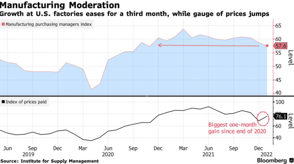 Rast výroby v USA podľa údajov zverejnených v utorok v januári 2022 klesol tretí mesiac po sebe. Predovšetkým miera továrenskej aktivity Inštitútu pre riadenie zásobovania dosiahla 57,60, čo je najhoršia úroveň od novembra 2020 v porovnaní s 58,80 mesiac predtým.