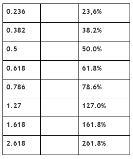 13 : 21 = 0,618 (61,8 %), 21 : 55 = 0,382 (38,2 %), 34 : 21 = 1,618 (161,8 %).