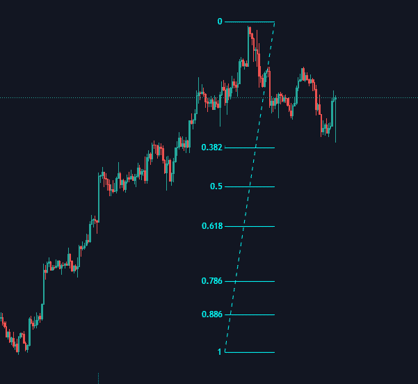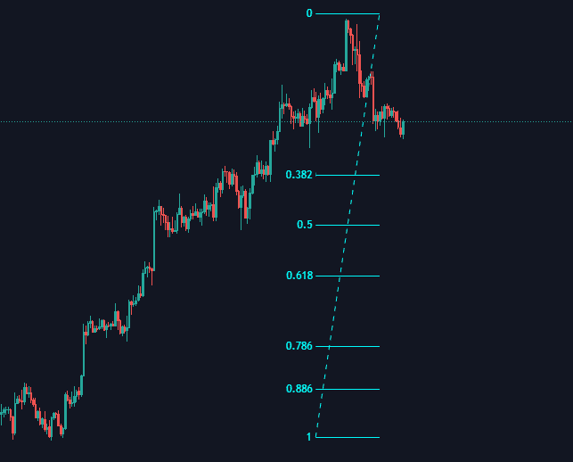 V prípade klesajúceho trendu je funkcia rovnaká, ale musíme potiahnuť indikátor z 1 na 0 smerom nadol. Vidíme, že stúpajúci trend sa zastavil na úrovni 61,8 % retracementu.