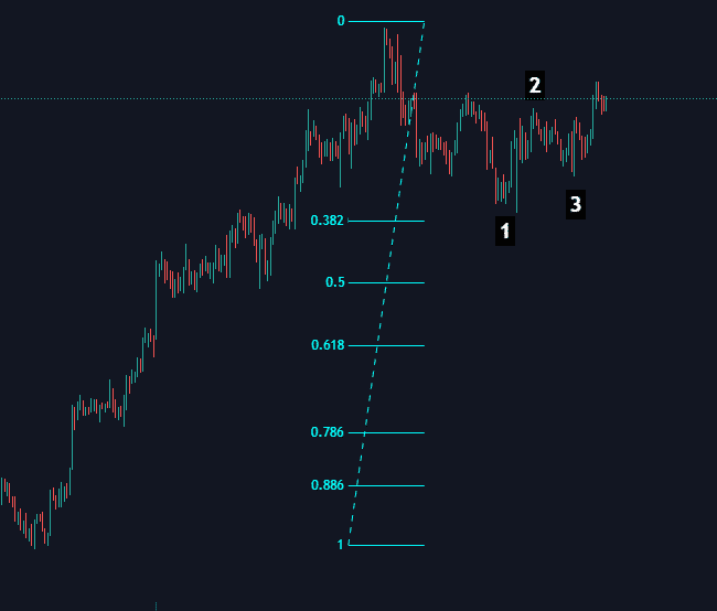 Sme ochotní akceptovať vyššie riziko výmenou za vyšší výnos. Ak cena (takmer) dosiahne úroveň 38,2 %, otvárame dlhú pozíciu na tejto úrovni, resp. trochu vyššie. Táto úroveň je veľmi populárna medzi obchodníkmi. Preto sa veľmi často aspoň na chvíľu cena na tejto úrovni zastaví a odrazí späť. To isté môžeme urobiť pri 50 % alebo 61,8 %.