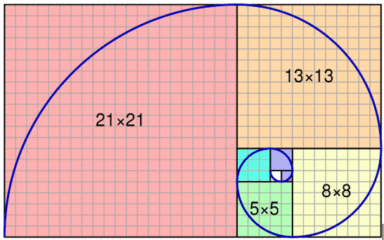 Ak nahradíme Fibonacciho čísla štvorcami a postupne ich poskladáme, dostaneme sa k obrázku nižšie, kde obsah obdĺžnika zloženého z týchto štvorcov môže byť buď súčtom ich obsahov, alebo násobkom jeho strán. (21x (21 + 13)) = 714. Tento obdĺžnik je príkladom takzvaného zlatého obdĺžnika. Všimnite si, že strany obdĺžnika môžeme rozdeliť na základe štvorcov s dĺžkou strany rovnou Fibonacciho číslam a výsledné pomery budú blízke ϕ. Ak potom opíšeme z Fibonacciho štvorcov kruh so stredom v jednom rohu a polomerom daného Fibonacciho čísla, dostaneme špirálu, a áno, hádate správne, zlatú špirálu – špeciálny prípad logaritmickej špirály.