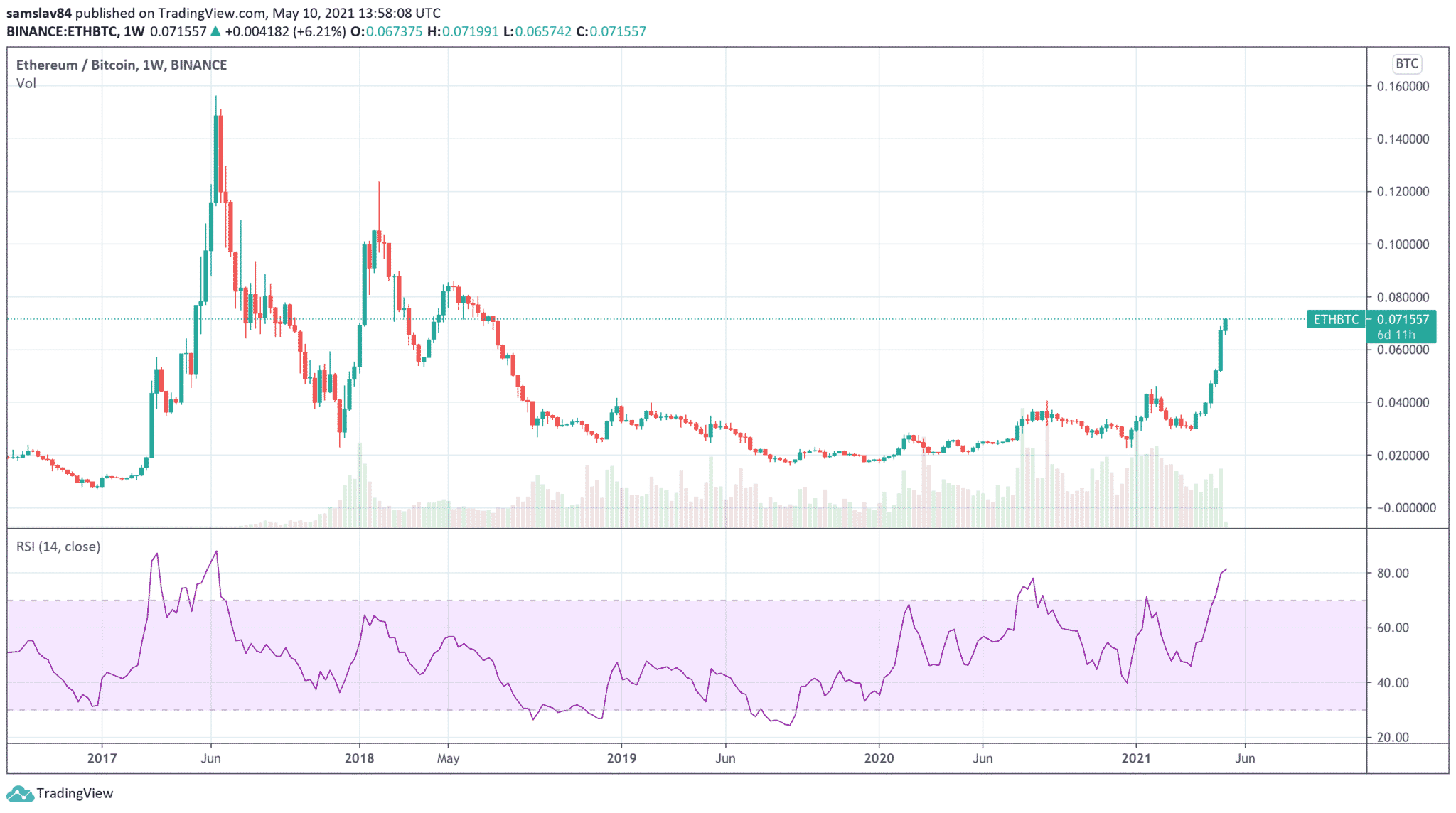 Ťažko tomu uveriť, no zatiaľ čo Bitcoin posledný týždeň stagnuje a posledné dva dni dokonca klesá, hodnota Etherea stúpla o neuveriteľných 30%. Keď také niečo predvedie Dogecoin, je to celkom sranda. Zopár špekulantov zarobí a Elon Musk postne ďalší tweet, resp. niečo kecne počas rozhovoru v televízii. Ale ak Ethereum voči Bitcoinu stúpne o 30% za týždeň, má to ďalekosiahly dopad na celý trh.