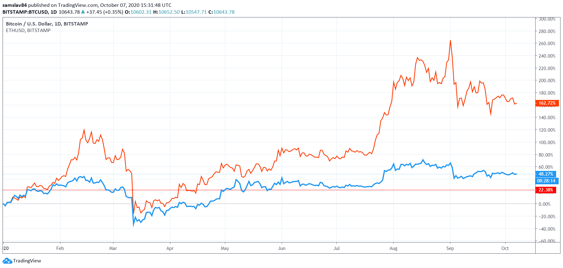 Toto je porovnanie rastu cien oboch kryptomien. Ako vidíte, Ethereum (oranžová čiara) malo od začiatku roka pred Bitcoinom (modrá čiara) slušný náskok.