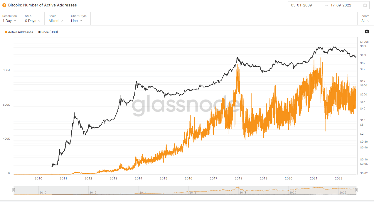 Aktívne adresy sú adresy blockchainu, ktoré sú aktívne v danom období. Prístupy k výpočtu sa líšia, ale populárnou metódou je počítať odosielateľa aj príjemcu každej transakcie počas stanovených období. Niektorí tiež skúmajú počet jedinečných adries kumulatívne, čo znamená, že sledujú celkový počet v priebehu času.