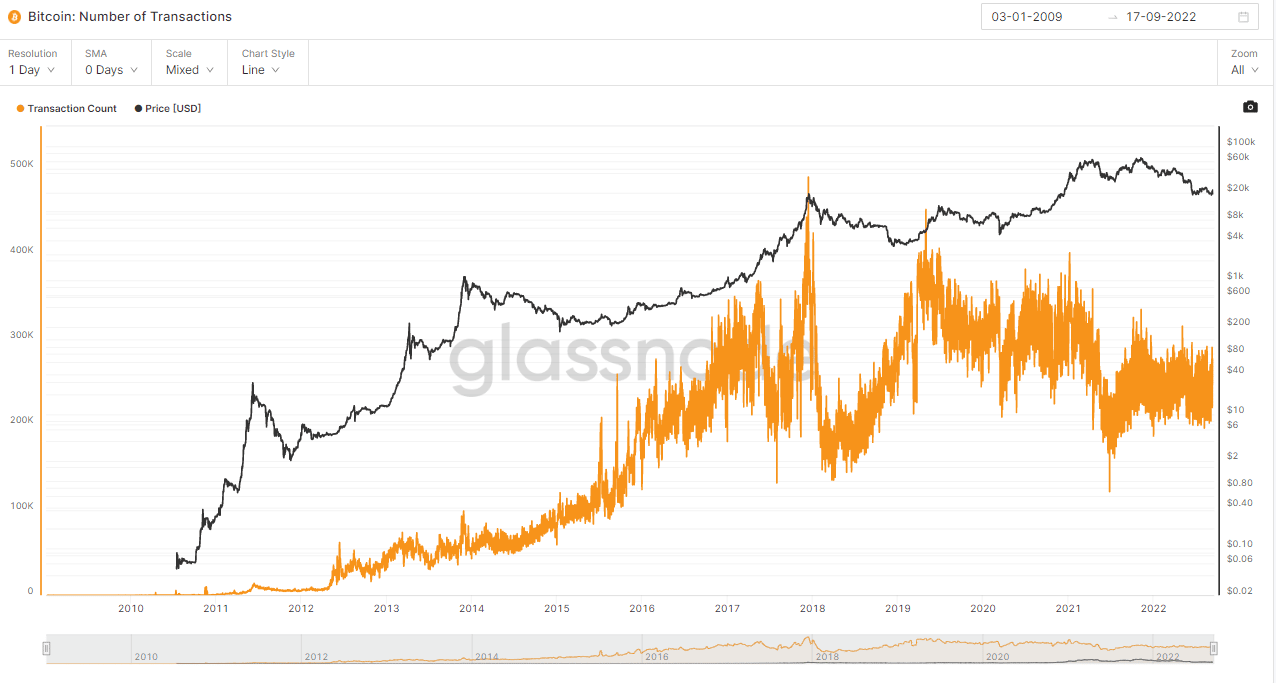 Počet transakcií je dobrým meradlom aktivity v sieti. Pomocou čísla za dané obdobia (alebo pomocou kĺzavých priemerov) môžeme vidieť, ako sa aktivita mení v čase.