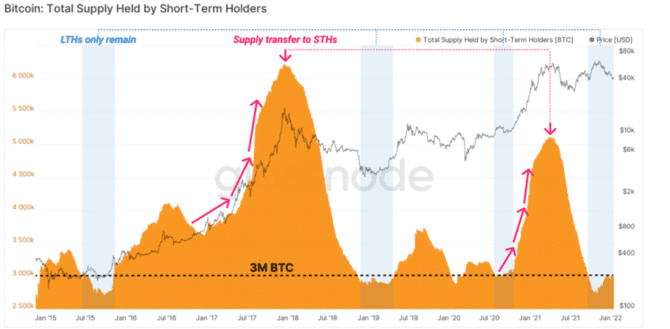 Ponuka v držbe STH je cca 3 milióny BTC, čo je relatívne historické minimum a úroveň, ktorá znamená prechod na trh, v ktorom dominuje HODL.