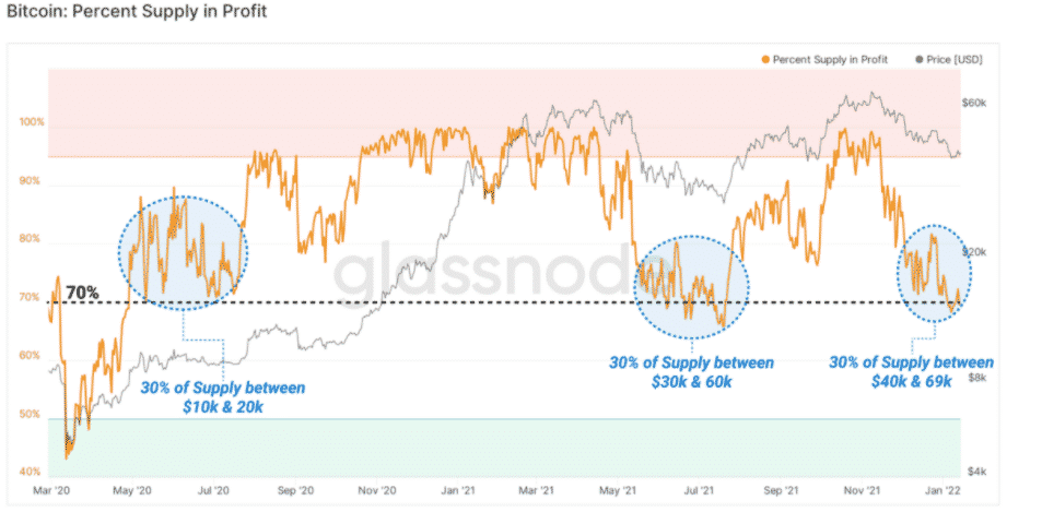 Pri pohľade späť na historickú cenovú výkonnosť Glassnode odhaľuje, že len čo sa 30 % ponuky dostane do straty, často dochádza k odrazom cien.