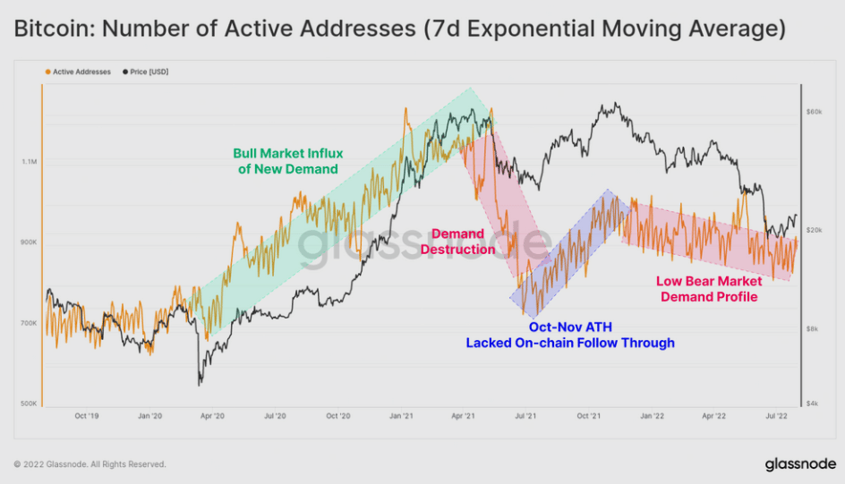Z dlhodobého hľadiska je trend aktívnych adries rastúci. Teraz však na grafe prevláda klesajúci trend. Medzi októbrom a novembrom 2021 nastal posledný rastúci trend, ktorý však nebol podporený dostačujúcim dopytom a cena nedokázala prekonať ATH.
