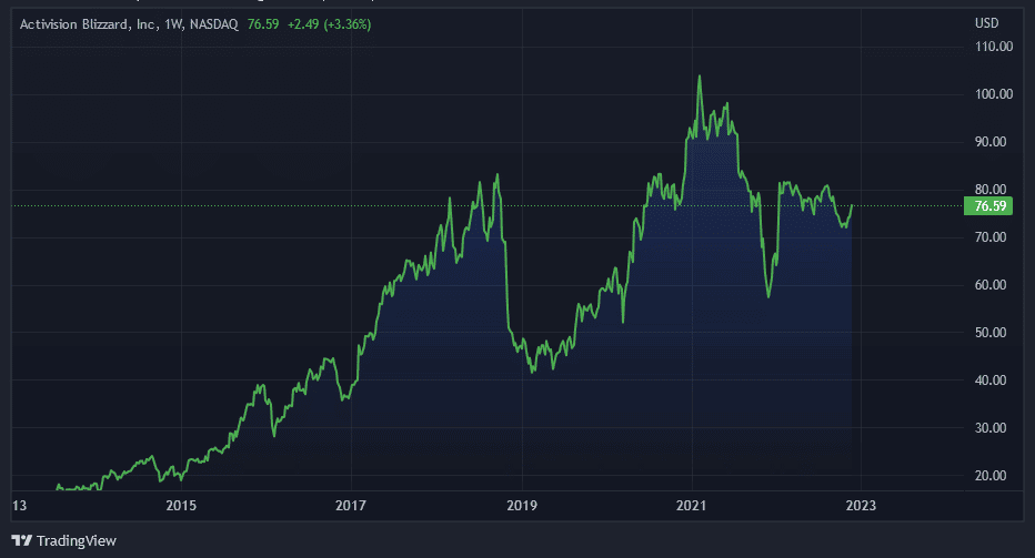 Ďalším technologickým gigantom, ktorý si drží nielen pevnú základňu akcionárov, ale aj odoláva kríze, je firma Activision Blizzard, ktorá sa špecializuje na vývoj a distribúciu hier a video hier. Cena akcie spoločnosti sa v roku 2021 vyšplhala až na 103 dolárov a v súčasnosti je od svojho minuloročného maxima vzdialená o 26 %. Aj Blizzard v 3. kvartáli vykázal väčší zisk, ako sa očakávalo, čo svedčí o stabilnom aj rastúcom záujme hernej komunity o produkty firmy. Predpokladalo sa, že zisk na akciu bude približne 0,42 dolára, ale výsledky priniesli investorom až 0,55 dolára za akciu.