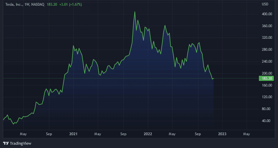 Firma miliardára Elona Muska, ktorá sa špecializuje na vývoj a výrobu elektromobilov, zaznamenala počas posledného rastúceho trendu na trhoch väčšie zhodnotenie. Dôvodom je aj väčší záujem o ekologicky a environmentálne prijateľnejšie možnosti dopravy, ako je doprava postavená na fosílnych palivách. Akcie Tesly (TSLA) od svojich minuloročných maxím klesli z hodnoty 413 dolárov za akciu na súčasných 183,2, čo je prepad o viac ako 50 %. Podľa analytika Harisa Anwara „súčasné oslabenie akcií ponúka atraktívny vstupný bod,” ktorý umožňuje investorom kúpiť akcie spoločnosti vo výpredajovej cene.