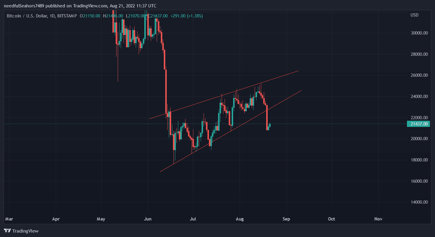 Bitcoin za jeden stratil 10 % zo svojej hodnoty a klesol opäť nakrátko pod 21 000. V čase písania tohto článku sa vlajková kryptomena obchoduje za 21 380 dolárov. Trhová kapitalizácia kryptomien za jeden deň klesla o 70 miliárd dolárov, čo je pokles, ktorý vymazal rast z predchádzajúcich týždňov. Na tento scenár sme upozorňovali aj v minulosti, keďže Bitcoin vytváral vzorec rising wedge, ktorý zväčša končí prerazením smerom nadol a následným poklesom.