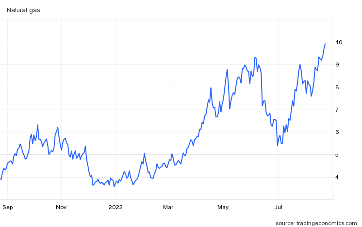 Cena zemného plynu v pondelok narástla o 16 %. Stalo sa tak po tom, čo ruský koncern Gazprom oznámil, že od 31. augusta až do 2. septembra bude prebiehať oprava turbíny plynovodu Nord Stream 1. To zvýšilo na trhu s energiami napätie a obavy z toho, že avizovaný termín nemusí byť dodržaný, čo by následne negatívne ovplyvnilo európske a predovšetkým nemecké zásoby zemného plynu, ktoré sú aj tak v súčasnosti nedostatočné.