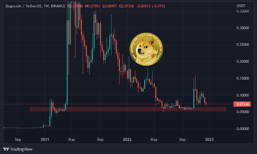 Dogecoin od svojho maxima v roku 2021 klesol o 90 %. Pri pohľade na týždenný graf (graf 1) môžeme vidieť, že sa kryptomena približuje k ďalšej zóne supportu. Pokiaľ teda bude výpredaj pokračovať, môže sa stať, že DOGE stratí zo svojej súčasnej ceny takmer 30 %. Zóna, kde sa pokles pravdepodobne zastaví, predstavuje hladinu, ktorá slúžila ako support kryptomene v roku 2021 aj počas roka 2022 v mesiacoch jún až október.