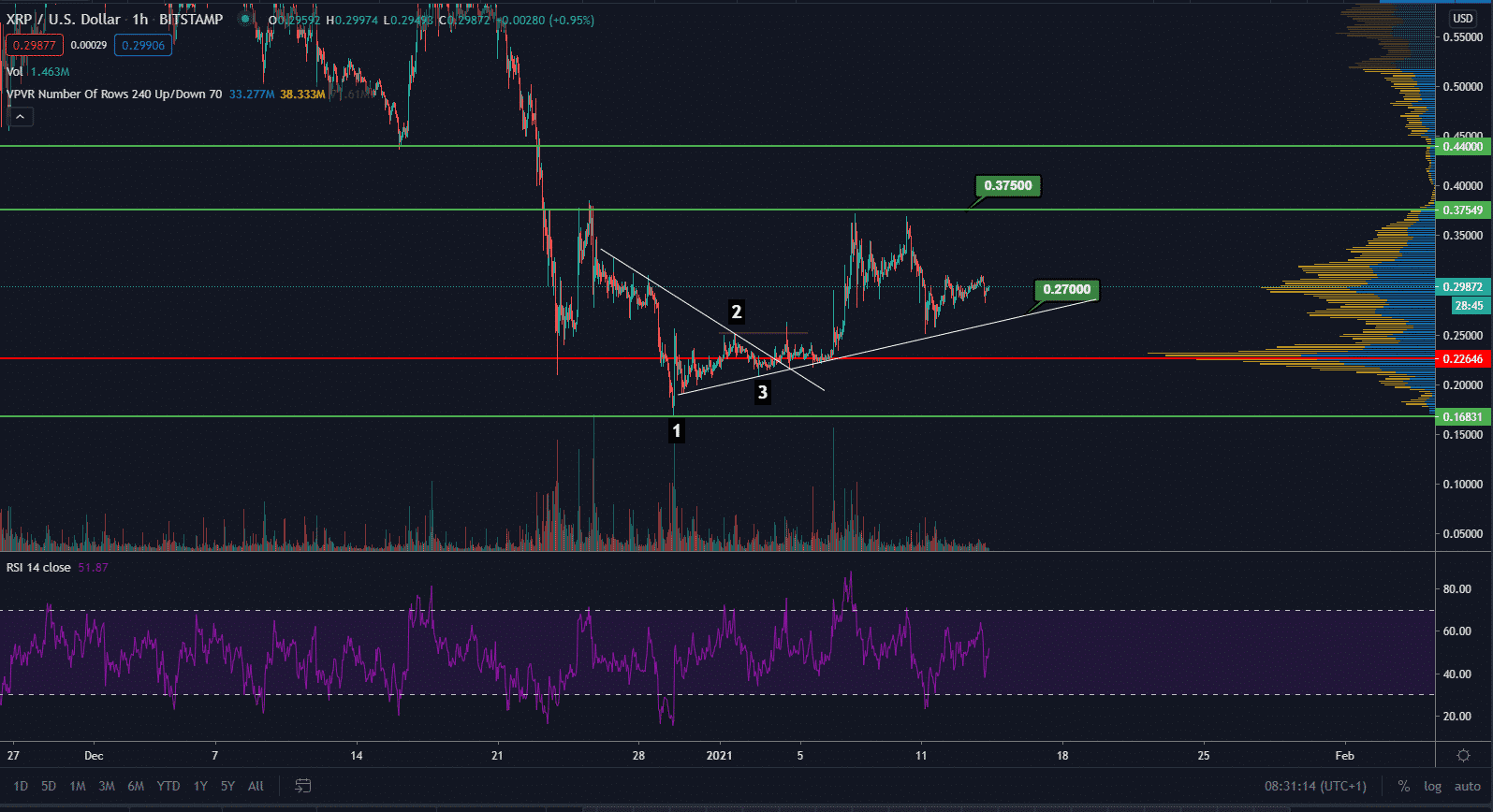 XRP sa momentálne obchoduje za 0,30$ no nedokázal prekonať rezistenciu na hodnote 0,375$. Zatiaľ je tak rastúci trend iba mierny. Podpora je na hladine 0,27$.