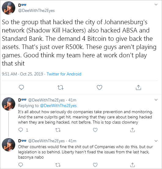 Zdá sa, že Shadow Kill Hackers sa činia. Johannesburg totiž nie je ich jediný „úlovok”. Internet hlási, že podobné problémy má aj Standard Bank, Absa a tri ďalšie banky. Je vtipné, že aj tieto banky budú musieť zaplatiť výkupné v Bitcoinoch.