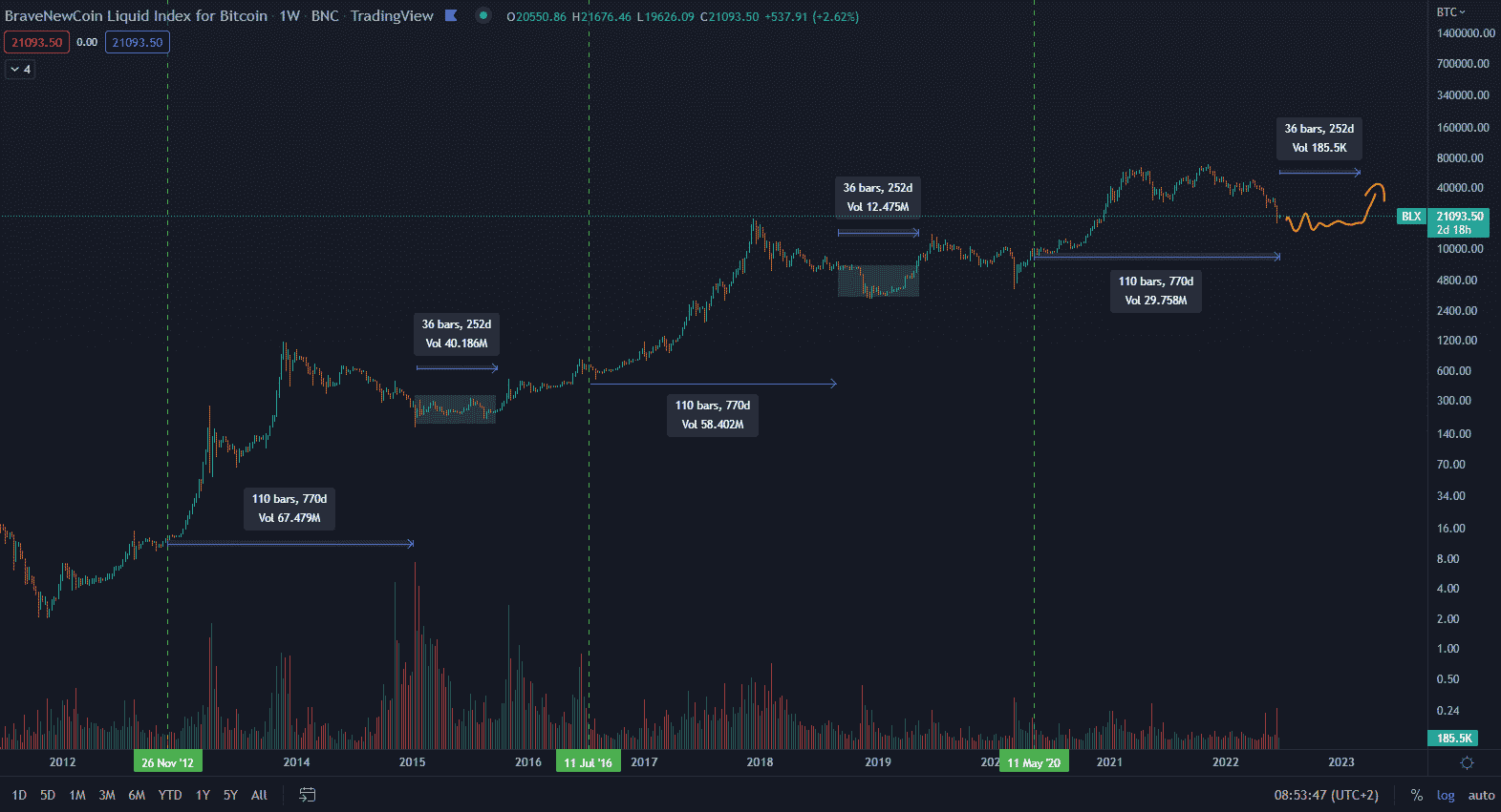 Na základe tejto jednoduchej časovej kalkulácie by sme mohli špekulovať nad tým, že cene bude trvať zhruba ďalších 252 dní, kým sa spamätá z korekcie a nastane rastúci trend. To znamená, že rastúci trend podľa halvingovej kalkulácie nastane približne v marci 2023.