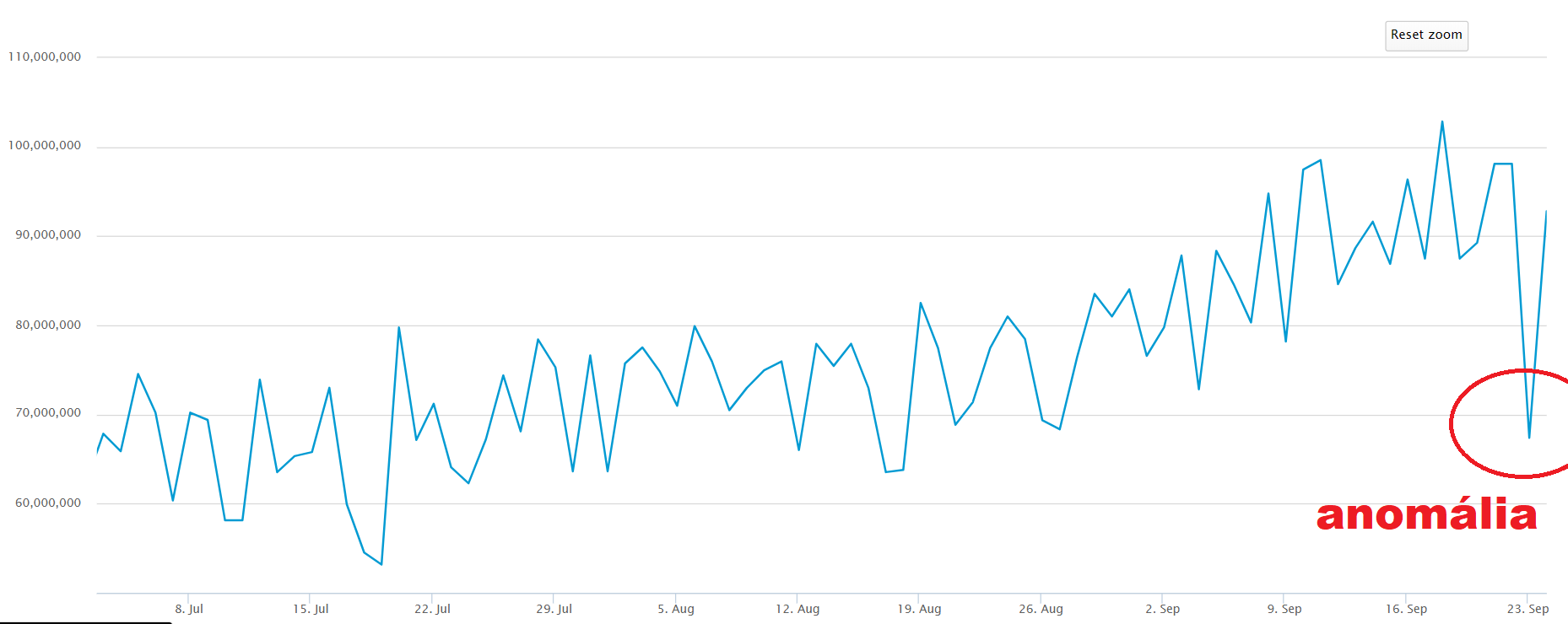 23-24.9 sme však zaznamenali veľkú anomáliu. Hashrate celej siete záhadne padol o viac než 40%. Podľa webu cointelegraph klesol na necelých 57 exahashov, v čase písania tohto článku je to už o 10 exahashov viac. Momentálne nie je jasné, čo spôsobilo tento pokles.