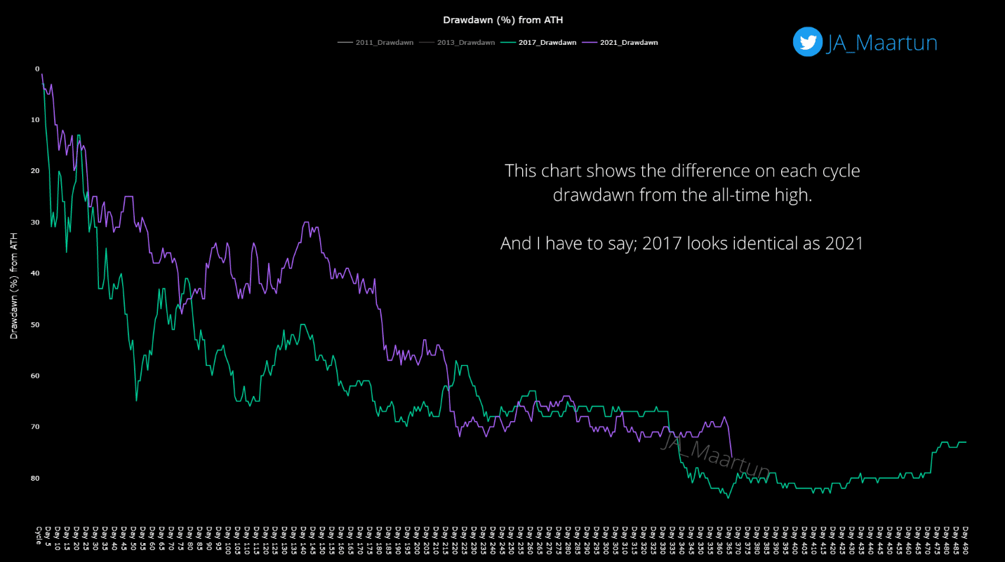 Bitcoinové cykly z roku 2017 a 2021 zaznamenali nové minimá okolo hranice 1 roka od vrcholu. Analýza počíta s percentuálnym poklesom ceny BTC po historickom maxime každého cyklu. Na grafe nižšie môžeme vidieť súčasnú a predošlú korekciu. Podobnosť cyklov je prekvapivá, aj keď sa pozrieme na nižšie časové rámce.