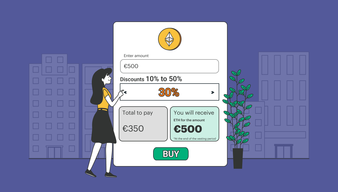Povedzme teda, že sa rozhodnete kúpiť Ethereum v hodnote 500 EUR s 30 % zľavou. Pri transakcii musíte zaplatiť len 350 USD, hoci vám bude okamžite pripísaná celá hodnota ETH vo výške 500 EUR, ktorá bude k dispozícii na výber na konci obdobia nároku.