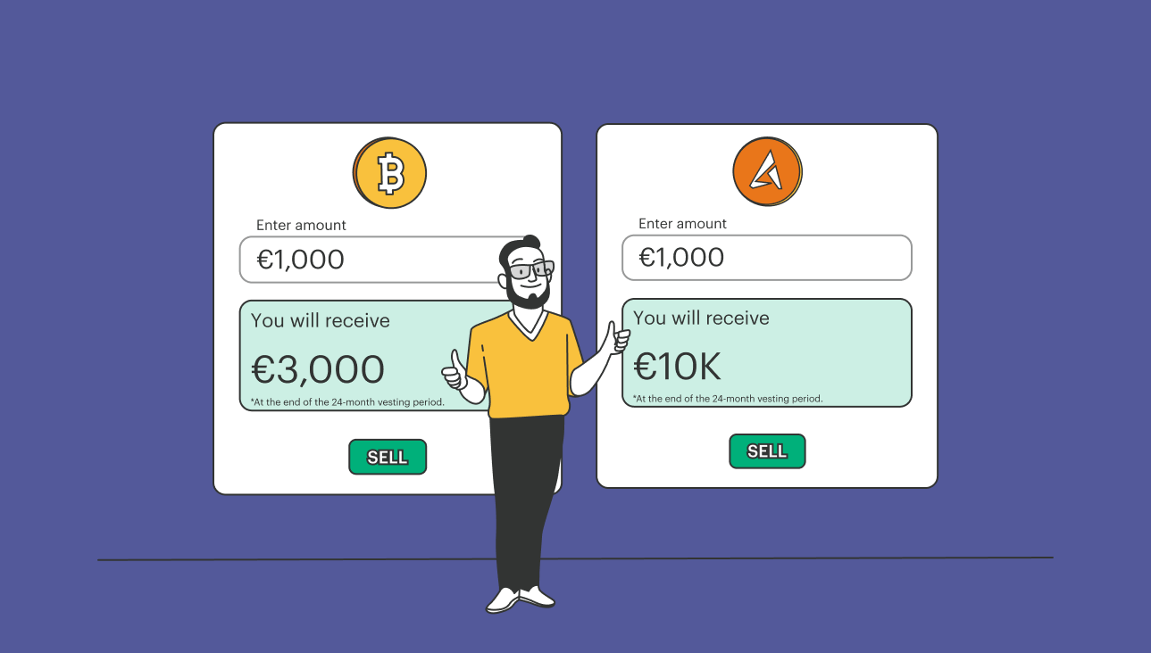 Ak napríklad predáte Bitcoin v hodnote 1 000 EUR, na váš účet sa pripíše 3 000 EUR, ktoré si môžete vybrať v okamihu, keď sa skončí 24-mesačné obdobie nároku. Ak namiesto toho predáte RBIS v hodnote 1 000 €, na váš zostatok sa pripíše 10 000 €, ktoré si môžete vybrať na konci obdobia nároku.