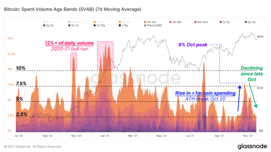 Konzistentné míňanie mincí starších ako jeden mesiac sa začalo v novembri 2020 a skončilo medzi aprílom a májom v roku 2021. Metrika SVAB teraz klesla späť na 2,5 % denného objemu od súčasného nárastu s historickým maximom BTC v októbri. Glassnode poznamenal: