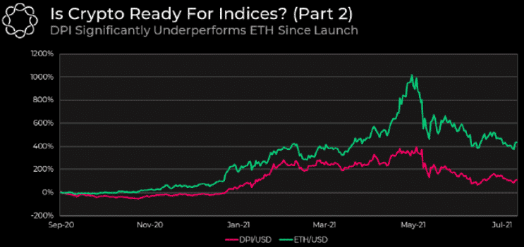 Porovnanie výkonnosti DPI a Etherea prinieslo prekvapivé výsledky. ETH dokázalo zvíťaziť z hľadiska ziskovosti a volatility. Aj keď toto porovnanie nie je úplne presné, opäť sa ukázalo, že riziko je v prípade indexov vyššie.