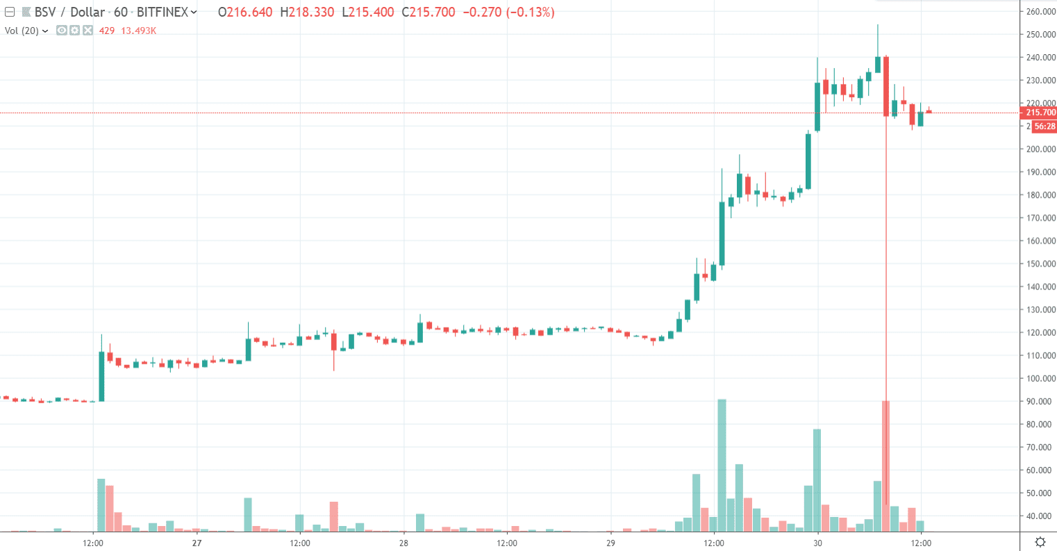 Kryptomeny sa očividne dostali do FOMO fázy, pretože začínajú reagovať na fake news. Nepravdivé správy o chystanom opätovnom zalistovaní coinu Bitcoin SV na burzu Binance hodnotu tejto kryptomeny vystrelili do nevídanej výšky. Aktuálne sa obchoduje za 220 $, no na vrchole to bolo neuveriteľných 255 $. Pred niekoľkými hodinami sme navyše boli na Bitfinexe svedkami flash crashu Bitcoinu SV na 45 $. Niekto jednoducho vykúpil celý order book.