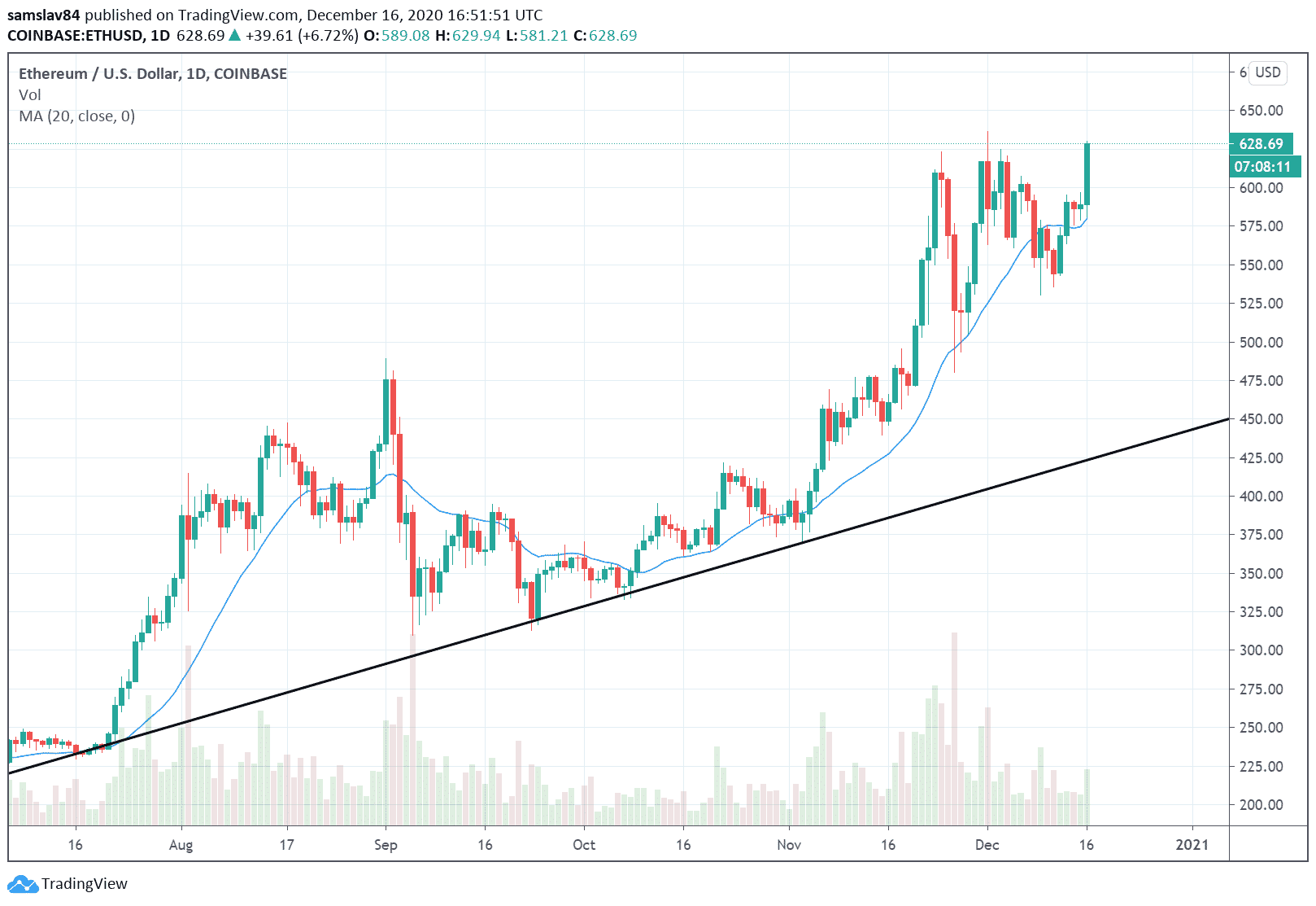 Kryptomena Ethereum dnes na krídlach silných fundamentov prekonala hladinu 600 $ a aktuálne testuje 630 $. Ak nepočítame knôt daily sviece z 1. decembra, naposledy sa tak vysoko obchodovalo v máji 2018.