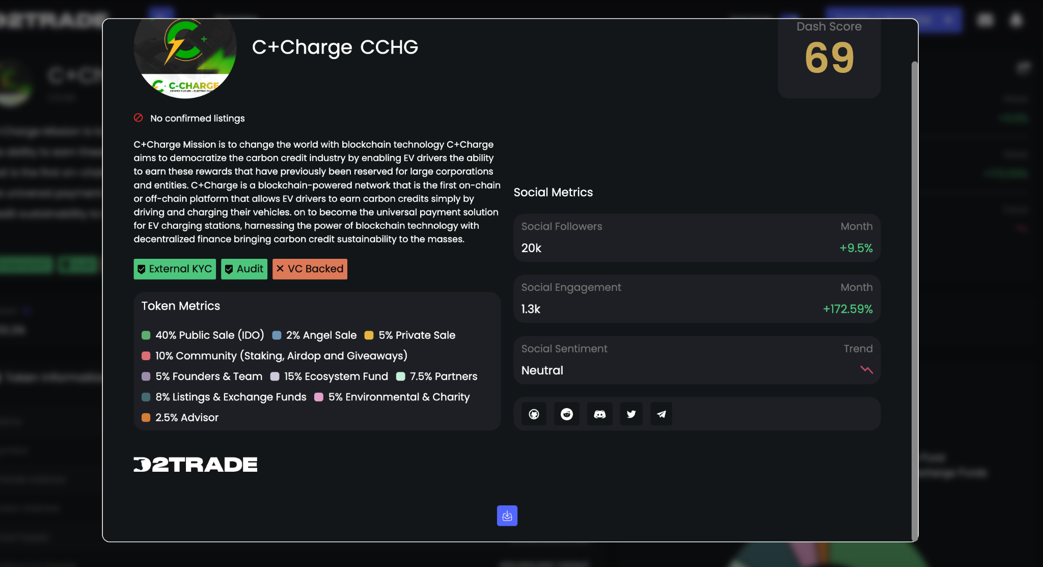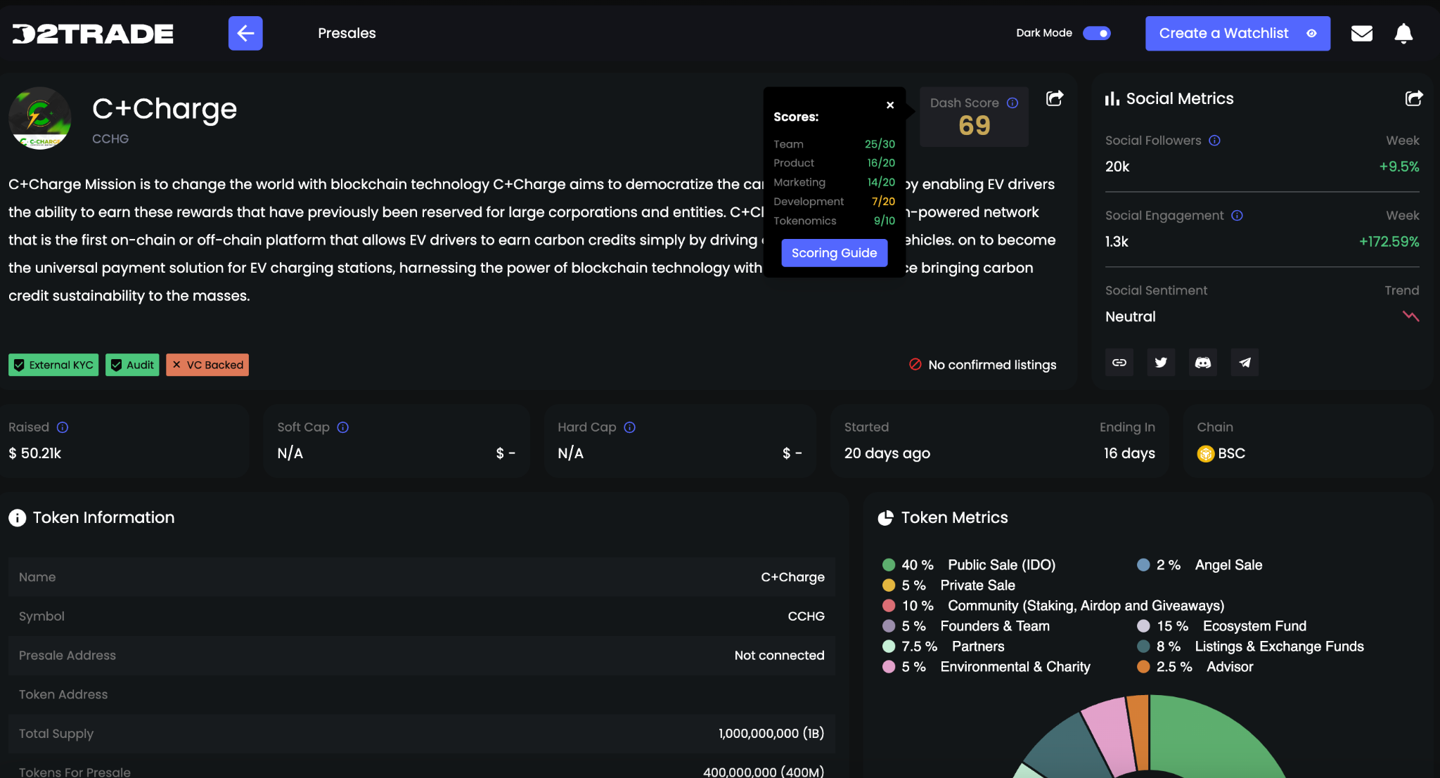 Po prejdení kurzorom myši na Dash Score sa zobrazí okno s podrobnosťami, v ktorom sa zobrazí päť hlavných oblastí hodnotenia – tím, produkt, marketing; vývoj a tokenomika.