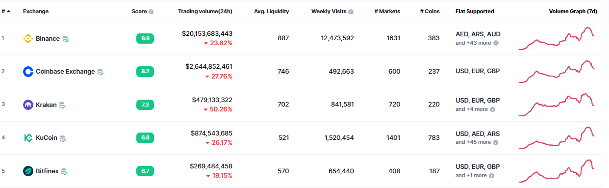 Podľa údajov z Coinmarketcap sa Binance nachádza na prvom mieste podľa denného objemu obchodovania s hodnotou približne 20,1 miliardy dolárov. Hneď na druhom mieste je americká burza Coinbase s objemom 2,6 miliardy dolárov. Následne môžeme vidieť, že žiadna ďalšia burza nedosahuje v čase písania článku objemy obchodov nad 1 miliardu.