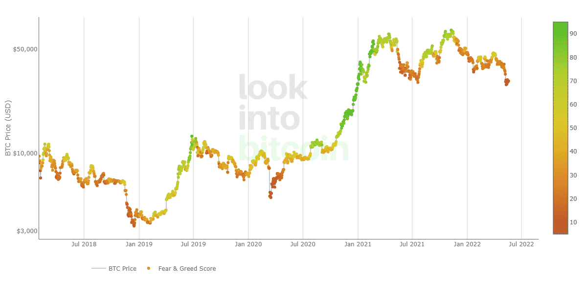 Veľmi zaujímavý je aj graf spoločnosti LookIntoBitcoin.com. Ten označuje dlhodobý graf BTC, aby tak dôkladnejšie ukázal informácie o indexe strachu a chamtivosti v daný deň.