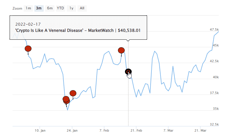 V tomto roku bolo zatiaľ zaznamenaných len 6 nekrológov. Posledný krát „Bitcoin zomrel” 17. februára 2022, keď sa jeho cena pohybovala na úrovni 40 538 USD. Vtedy legendárny investor Charlie Munger, ktorý je zároveň pravou rukou Warrena Buffetta, povedal: