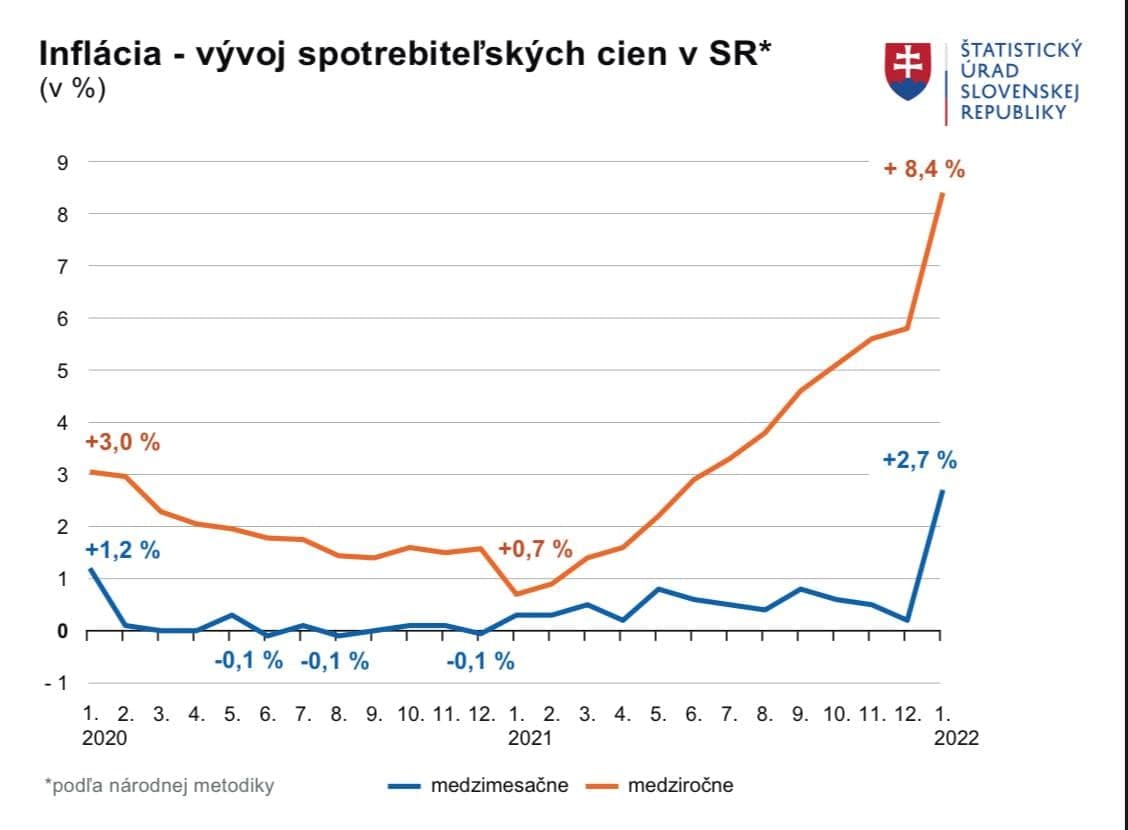 Počas posledných 10 rokov sa inflácia na Slovensku držala na úrovni okolo 0 až 4 %. Iba počas prvého mesiaca tohto roka ceny narástli o takmer 3 %. Očakáva sa, že ročná inflácia v roku 2022 bude na hodnote okolo 10 %. Naposledy takéto vysoké hodnoty malo Slovensko pred 19 rokmi, keď priemerné ceny vzrástli medziročne o 8,5 %.