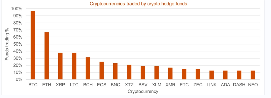 Väčšina sledovaných hedžových fondov (97 %) obchodovala s BTC, nasleduje ETH, XRP, LTC a BCH. Takmer každý fond poskytuje možnosť investovať do BTC. Ostatné altcoiny – až na ETH – výrazne zaostávajú.